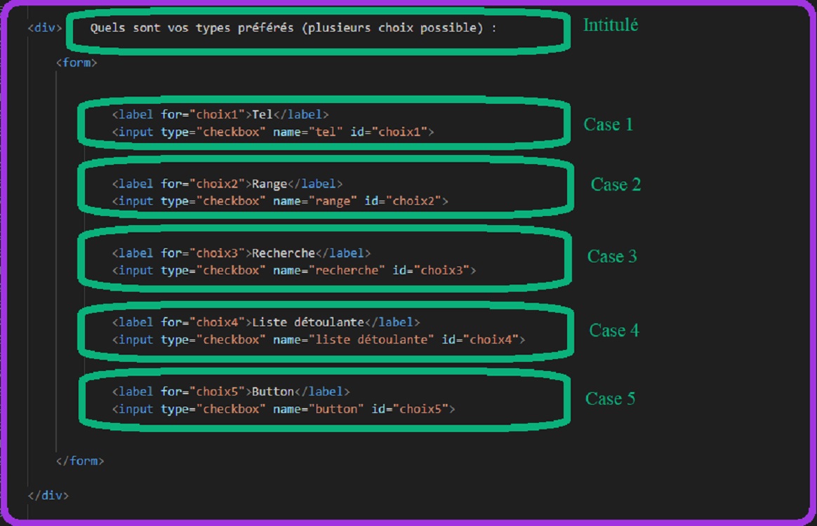 Exemple pour des boites à cocher à choix multiple. Checkbox veut dire "case à cocher".