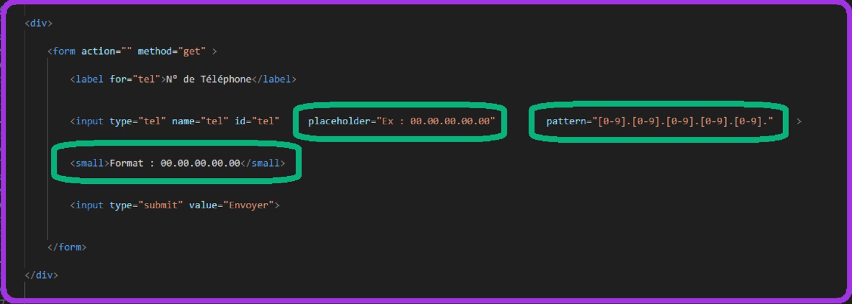 On mets "placeholder="00.00.00.00.00" qui va l'afficher dans la zone de saisie pour informer l'utilisateur du type de saisie que l'on attend de lui. Cela s'éfface des le premier clic dans la zone de saisie. On met paterne ="[0-9].[0-9].[0-9].[0-9].[0-9]." pour indiquer la saisie qui sera accepter. On met dans la div "small" ("strong" au autres) l'indication de ce que l'on attend comme genre d'information. Plus d'information : W3