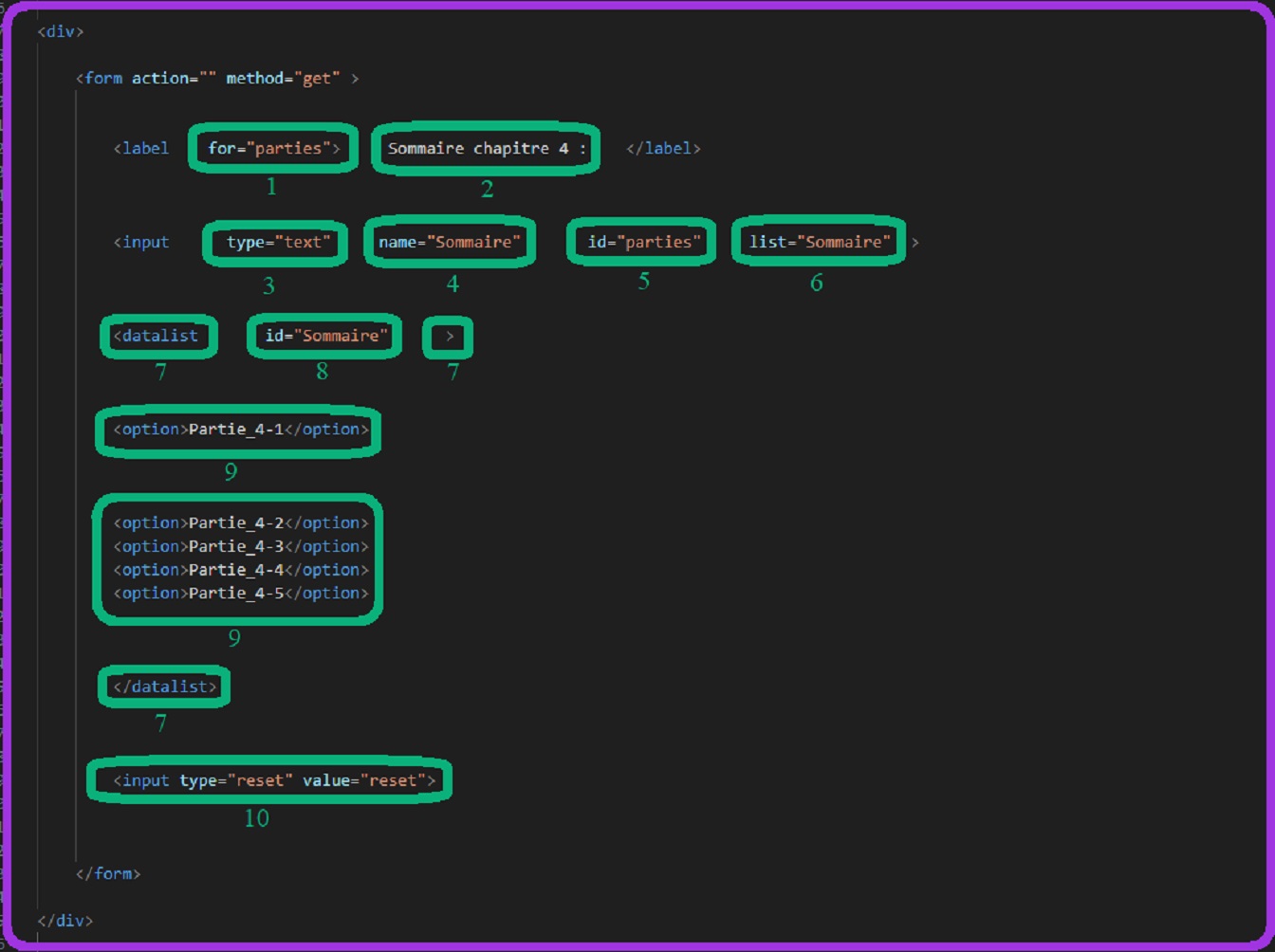 Cliquer sur l'image HTML dont voici le detail : N°1 : Le "for" avec "parties" relié à l'id="parties". N° 2 : l'intitulé. N° 3 : le "type" avec "text". N° 4 : le "name" avec "sommaire". N° 5 : l'"id" avec "parties" relié au for="parties". N° 6 : la "list" avec "sommaire" relié à l'id="sommaire" qui permet la selection avec la petite flèche au survol. N° 7 : la balise paire ‹datalist›‹/datalist› qui est relié à l'id et list avec "sommaire" pour que le contenu soit dans la zone. N° 8 : l'"id" avec "sommaire" pour que la datalist soit relié à l'input "list". N° 9 : les balises paires ‹option›‹/option› avec le contenu de chaque parties. N° 10 : rajout d'un bouton "reset" pour pouvoir changer de choix.