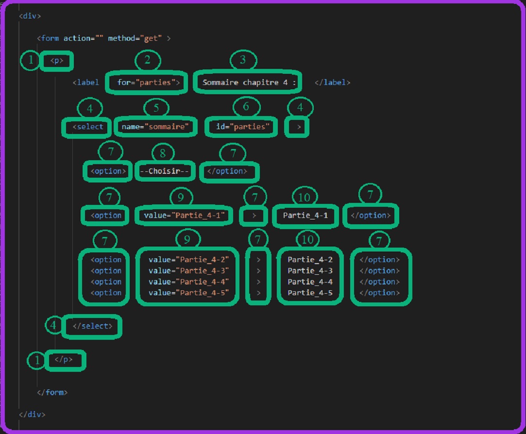 Cliquer sur l'image HTML dont voici le detail : N°1 : Mettre une balise paire "p". N° 2 : le "for" relié à l'id avec la même valeur "parties". N° 3 : Le libéllé. N° 4 : Mettre une balise paire "select". N° 5 : mettre le "name" avec la valeur souhaité, ici "sommaire". N° 6 : l'"id" relié au "for" avec la même valeur "parties". N° 7 : Mettre les balises paires "option" pour chaque choix. N° 8 : Il n'y a pas de value, c'est juste une indication, ici "--Choisir--". N° 9 : L'attribut "value" avec une valeur qui servira plustard à faire un lien. N° 10 : Libéllé des choix.