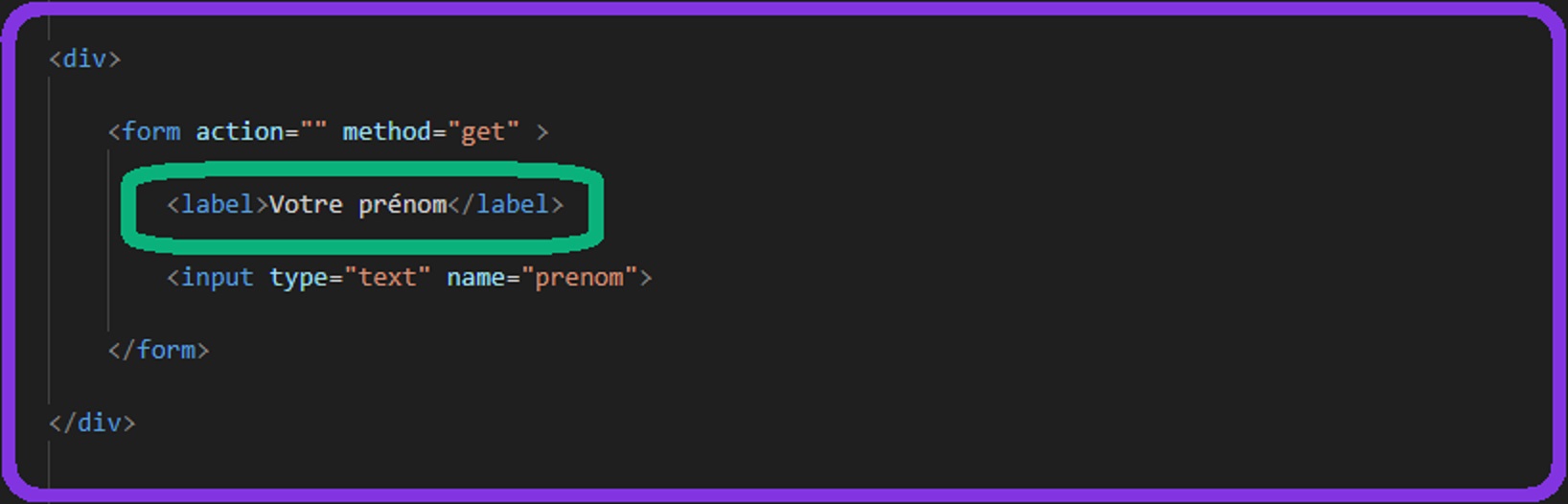 La balise ‹label›‹/label› permet de mettre un libellé, un titre. Un libellé est un champ de texte prérempli avec une indication pour guider le visiteur du site sur ce qu’il doit écrire. Pour cette exemple on met le contenu : Votre prénom.