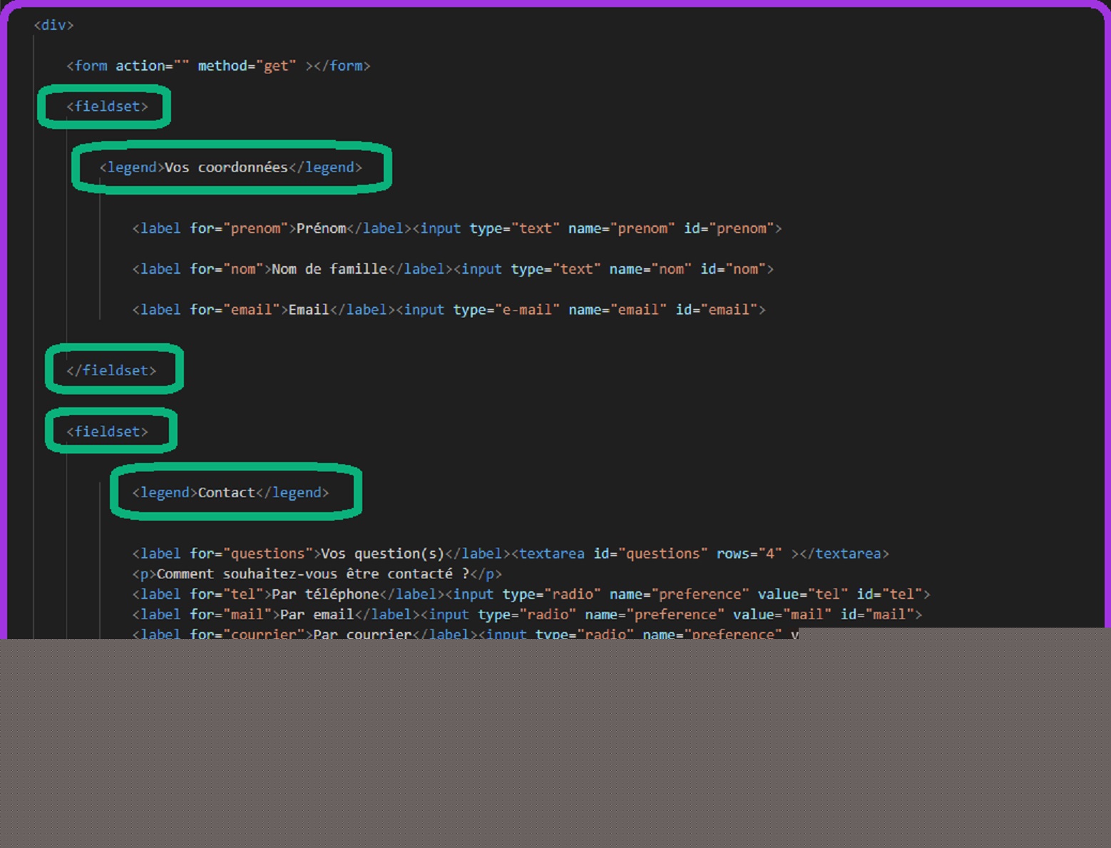 Ces balises paires permettente de modifier le sytle dans HTML sur les boites à cocher. Voir dans HTML : mettre les balises paires ‹fieldset›‹/fieldset› et ‹legend›‹/legend› avec les libellés dans celles de "legend". Chaque balise "fieldset" et son contenu créer un cadre. Il peut y en avoir plusieur comme ici.