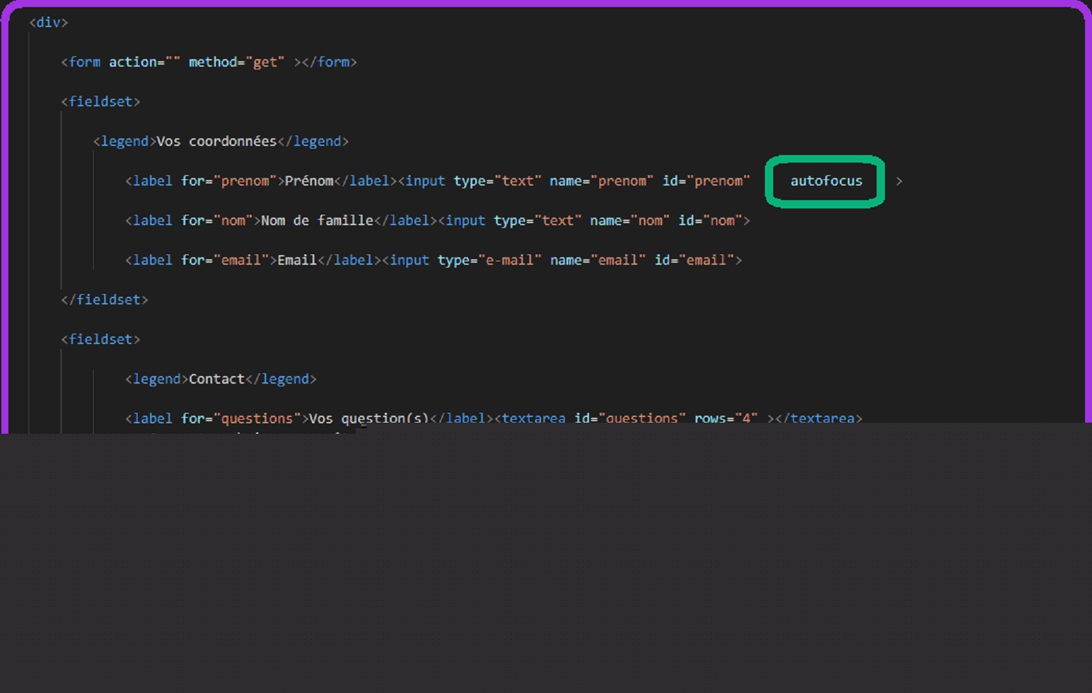 L'autofocus permet de placer le curseur dans un champ directement au chargement de la page. il ne peut être utilisé qu'une seule fois par page. Pour cet exemple, il est placé dans le premier champ "Prénom".