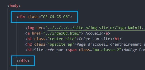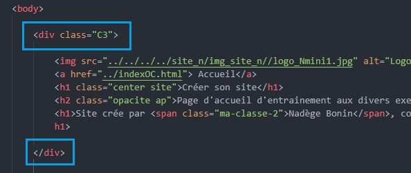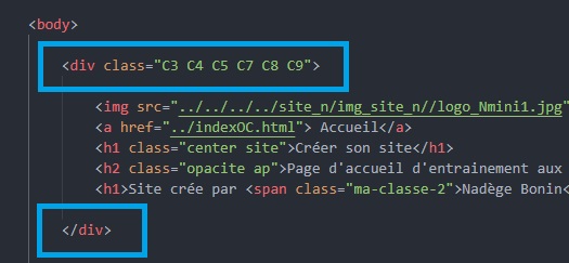• HTML : Mettre des balises ‹div›‹/div› pour déterminer le block voulu. Ecrire dans la première balise "div" : class="C3" pouc cette exemple. L'image est répéter, voir à la suite dans "positionnement de l'image".