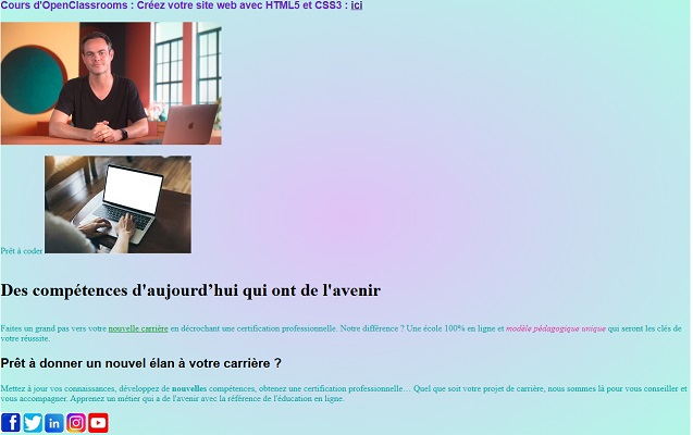 • CSS : Utiliser : background: linear-gradient (x, y). La valeur de la couleur "x" indiquer par quel couleur le dégradé commence. La vlaeur de la couleur "y" indique par quel valeur le dégradé fini. J'ai créer un block ‹div› pour le reste de la page.