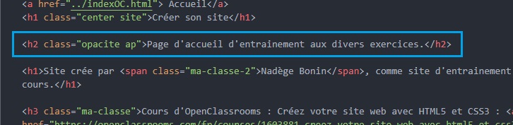 • HTML : Exemple sur la ligne "Page d'acceuil d'entrainement aux divers exercices. NB : Dans la ligne de code HTML, vu qu'il y a déjà la balise de l'exercice précedent, nous rajoutons la class="ap" à l'interieur comme ceci class="opacite ap".