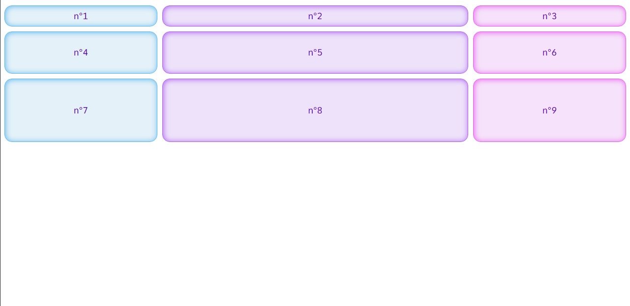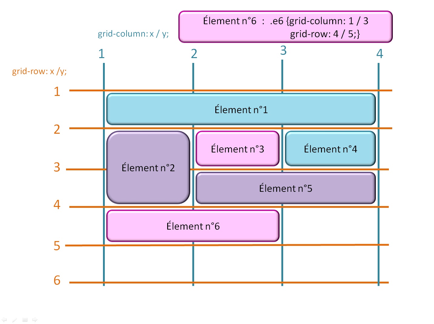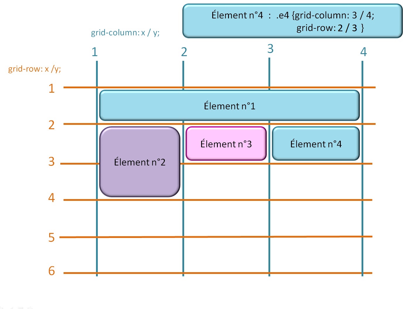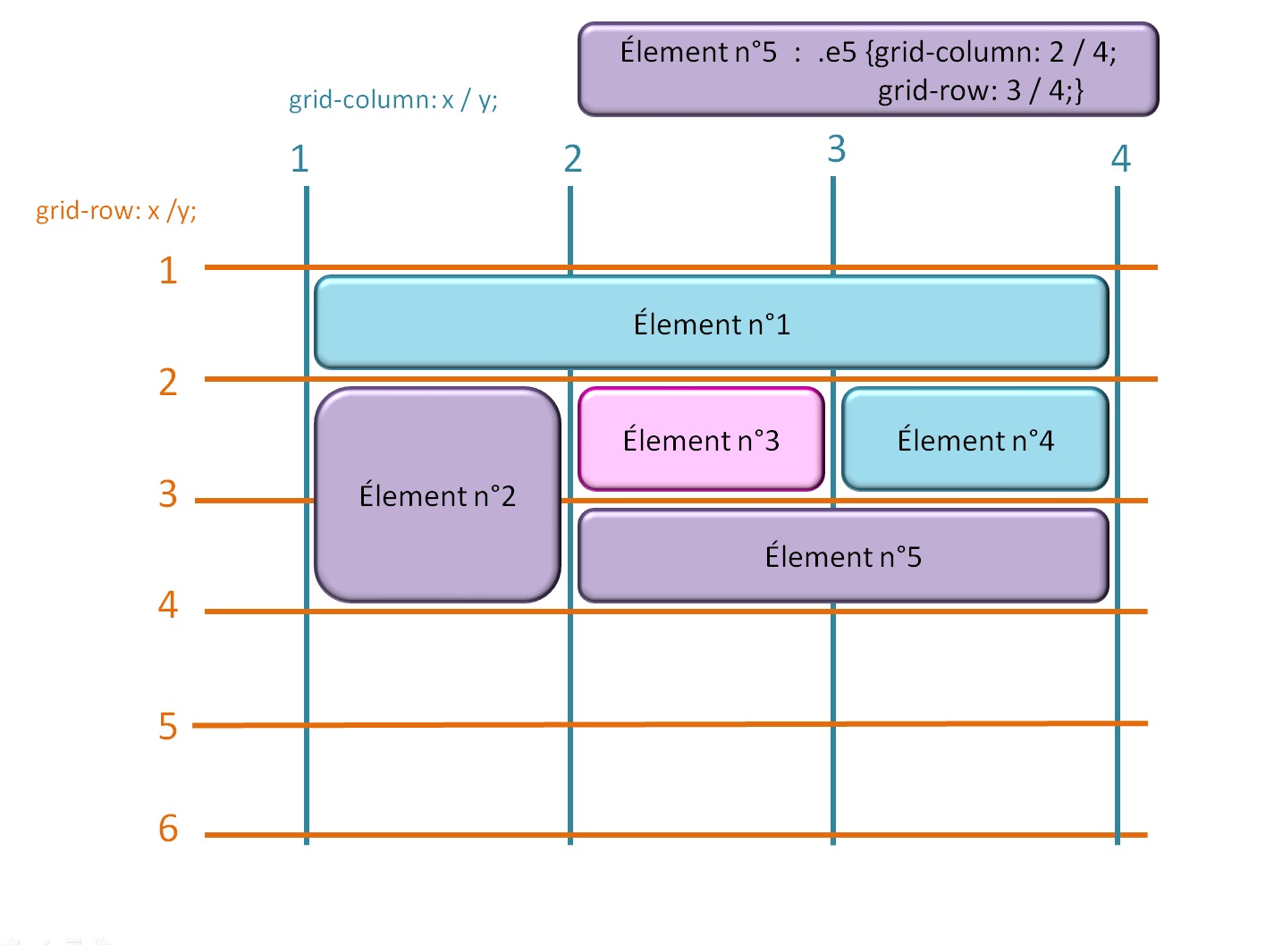 Dans ce genre de disposition, il y a des éléments à cheval sur plusieurs colonnes ou plusieurs rangées. Il faut bien savoir comme indiquer dans l'élémént 6, d'ou part l'élément, où est ce qu'il fini sur l'axe horizontal et où est ce qu'il fini sur l'axe vercital.