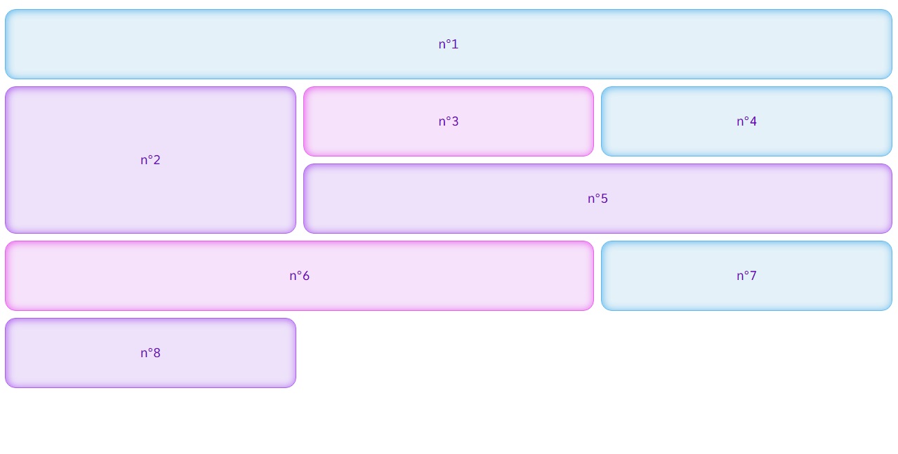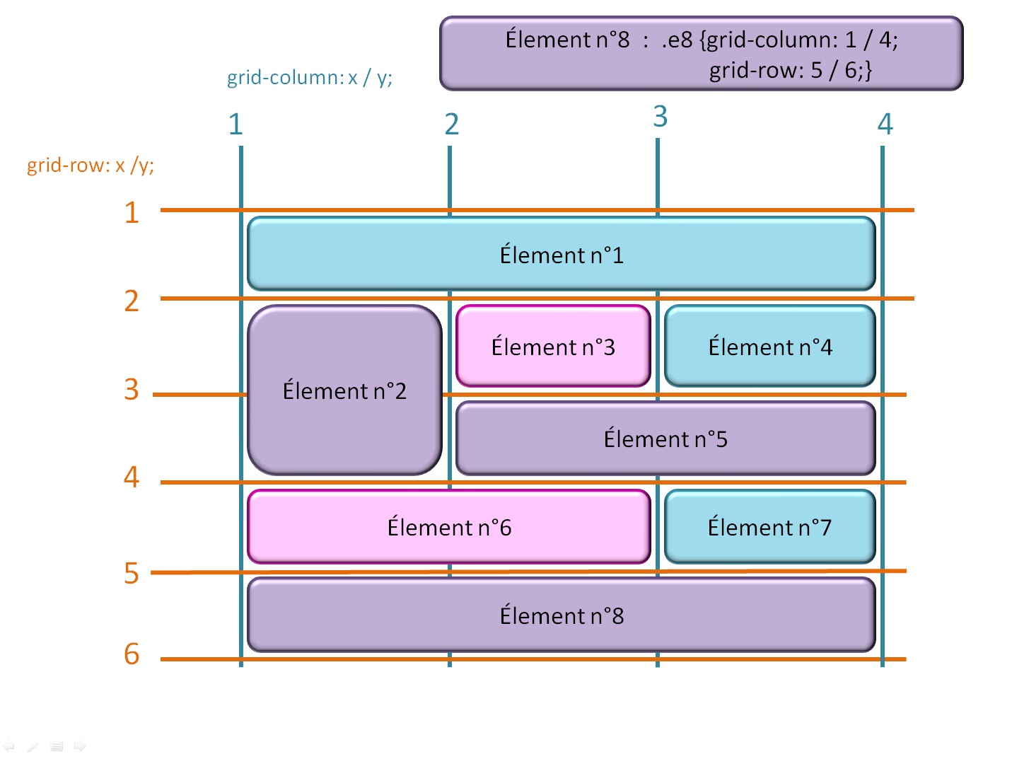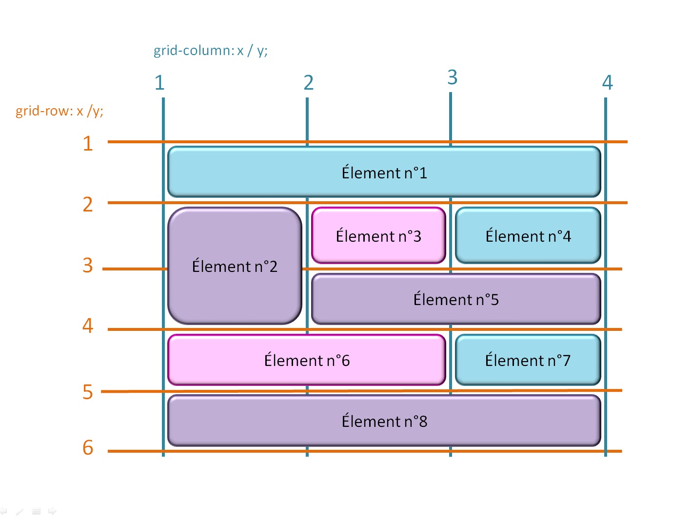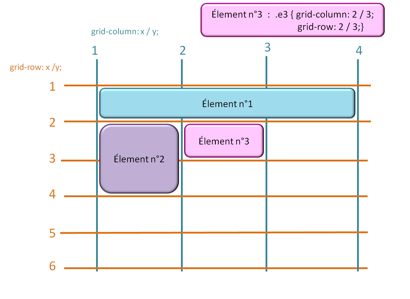Dans ce genre de disposition, il y a des éléments à cheval sur plusieurs colonnes ou plusieurs rangées. Il faut bien savoir comme indiquer dans l'élémént 6, d'ou part l'élément, où est ce qu'il fini sur l'axe horizontal et où est ce qu'il fini sur l'axe vercital.