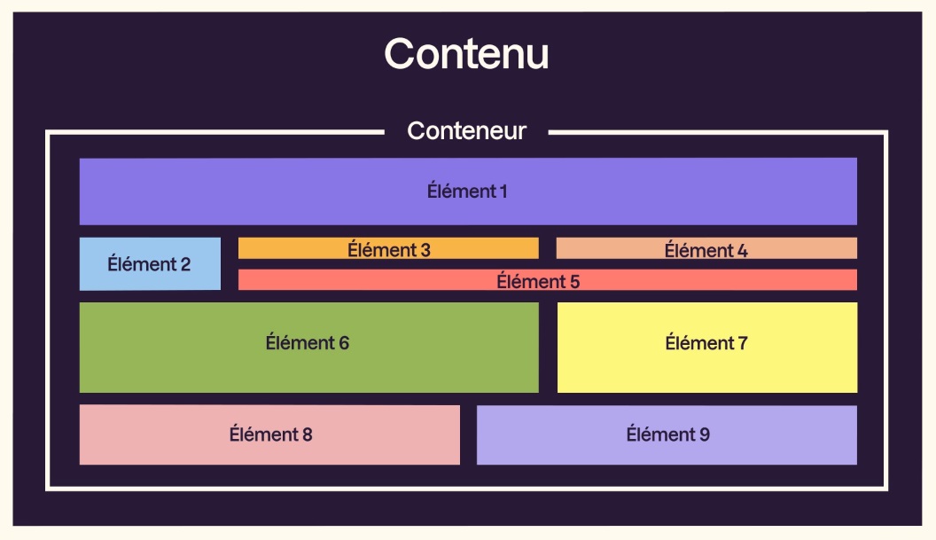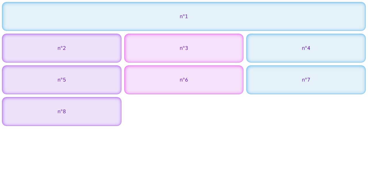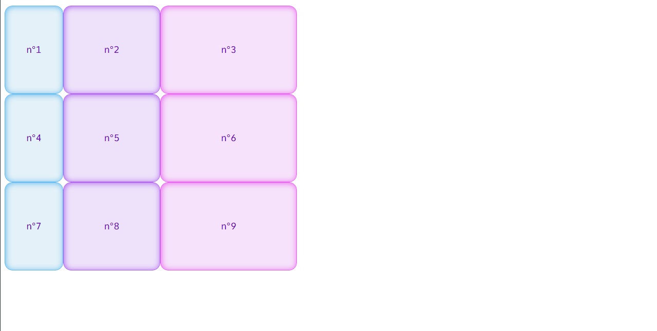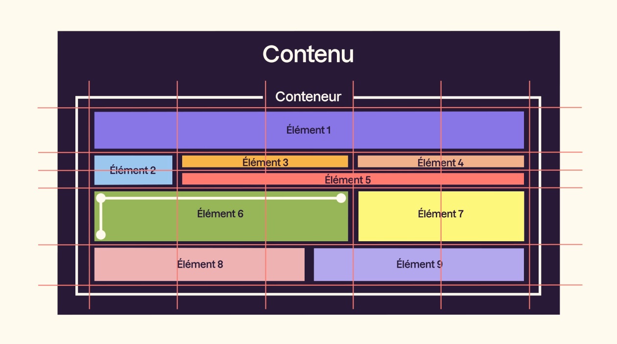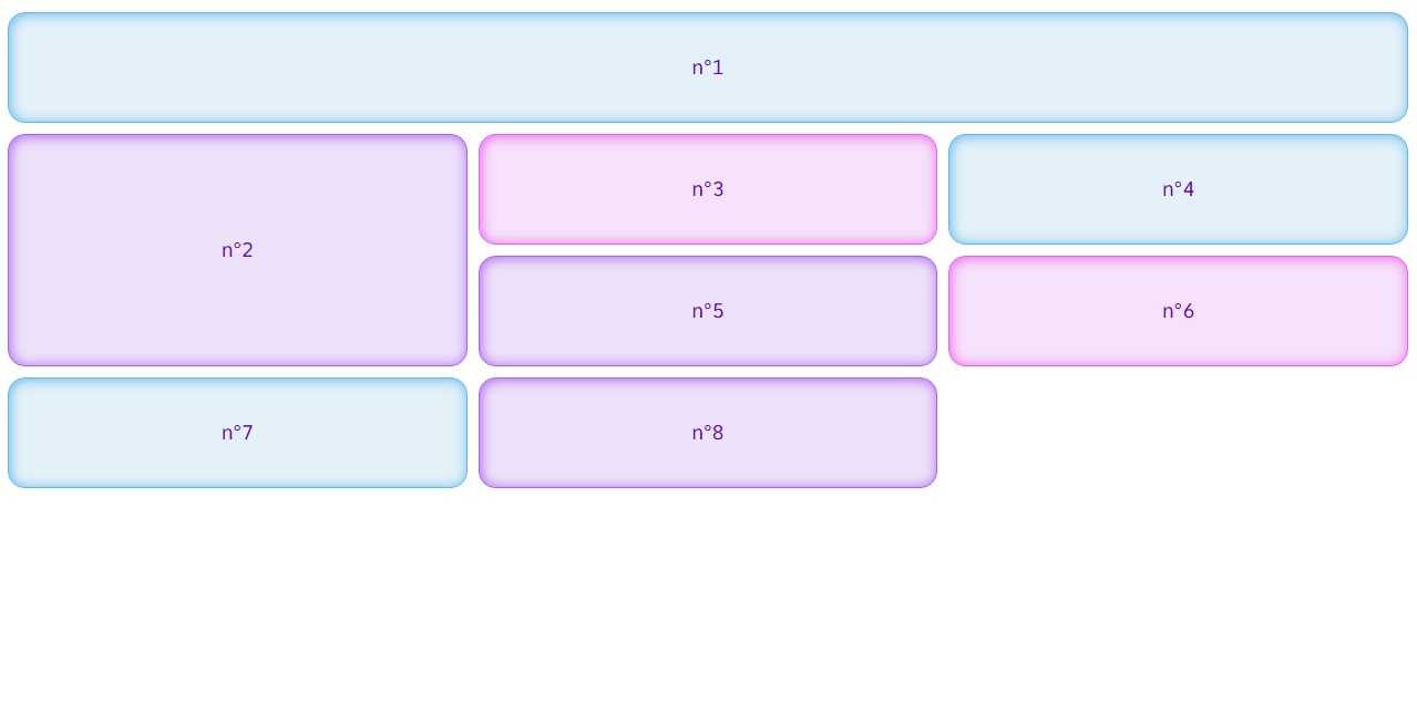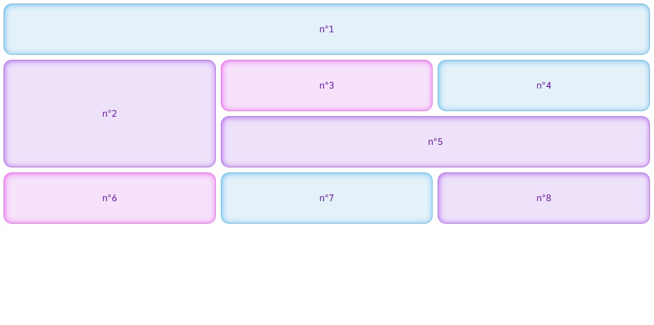 Dans ce genre de disposition, il y a des éléments à cheval sur plusieurs colonnes ou plusieurs rangées. Il faut bien savoir comme indiquer dans l'élémént 6, d'ou part l'élément, où est ce qu'il fini sur l'axe horizontal et où est ce qu'il fini sur l'axe vercital.