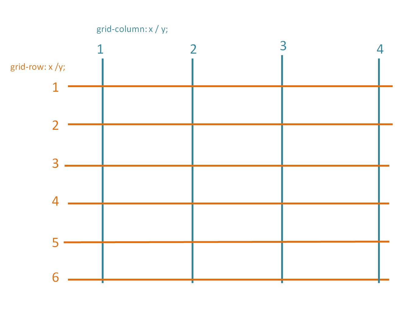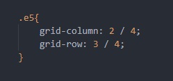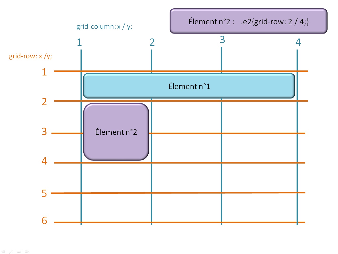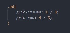"grid-row: x / y;" indique la ligne horizontale de départ (x) et d'arrivée (y) de l'élément en une seul ligne de commande CSS.
