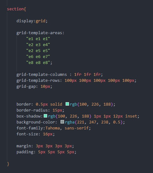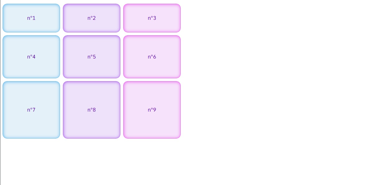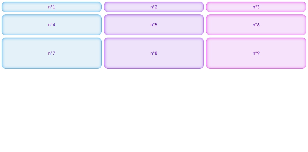 Préalablement, il faut créer une classe par block et créer 3 colonnes de 1fr et 5 rangées de 100px.