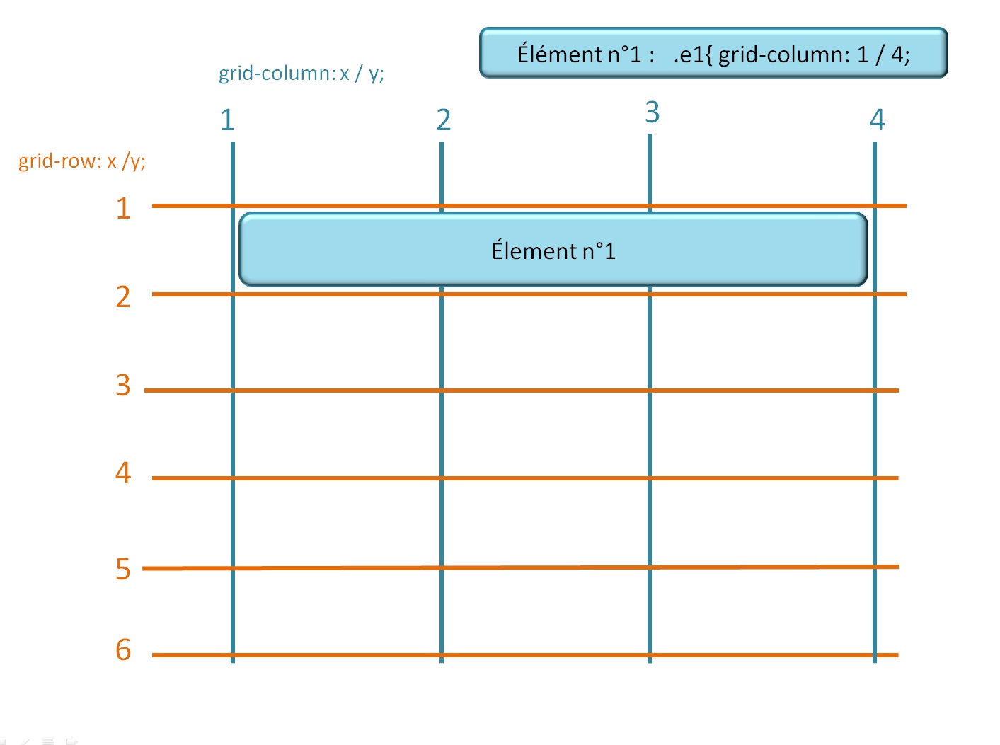 "grid-column-start: x;" indique la ligne verticale de départ (x) de l'élément.