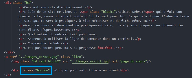 Changer un élément inline en élément block. Exemple sur "Mathieu Nebra" (block1) et l'image du cours (block2). Ils n'ont pas bougés du HTML, mais ne sont plus apparent sur l'affichage de la page.