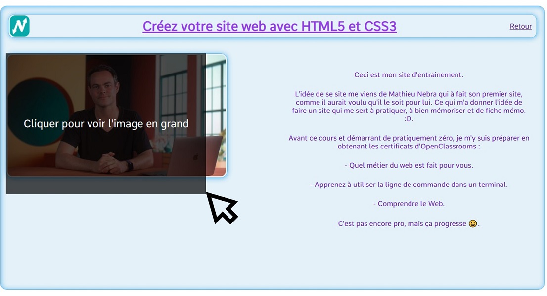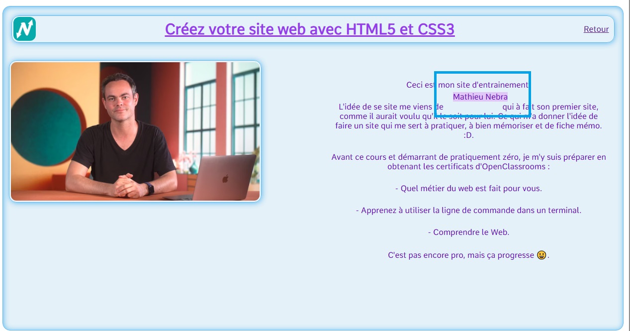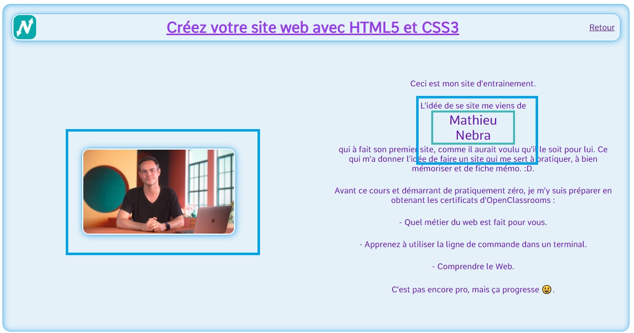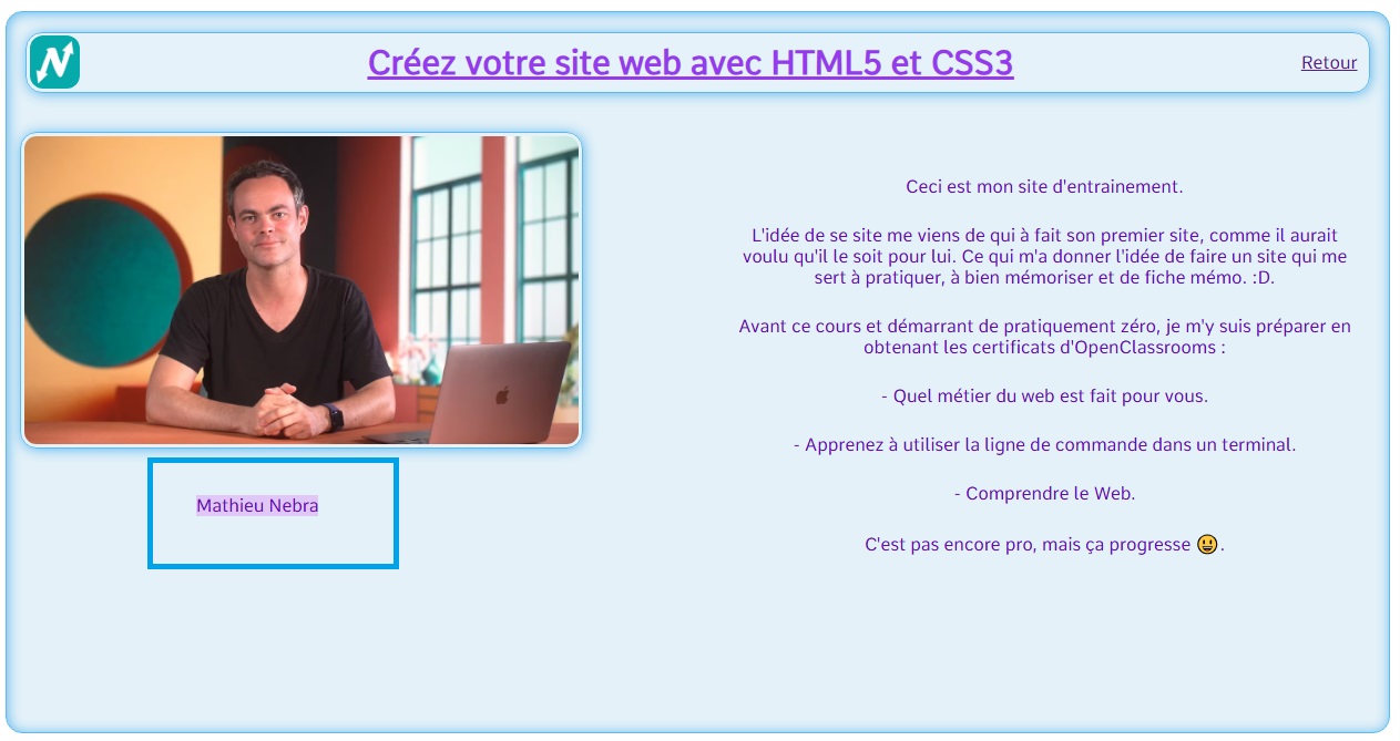 Changement de position précise d'un élément n'importe où sur la page. Exemple avec "l'image du cours" positionner au niveau de "Mathieu Nebra". On peut remarquer qu'ils se chevauchent, voir la suite pour résoudre se problème.