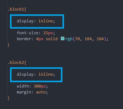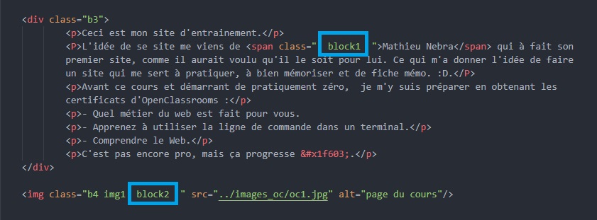 Changer un élément inline en élément block. Exemple sur "Mathieu Nebra" (block1) et l'image du cours (block2).